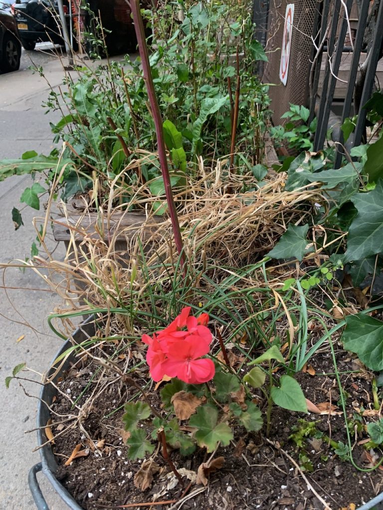 The growing season is drawing to an end, but this colorful geranium on the steps of 217 W 106th doesn’t seem to have gotten the memo and is putting on a show amidst the drying grass and slowly-yellowing leaves.